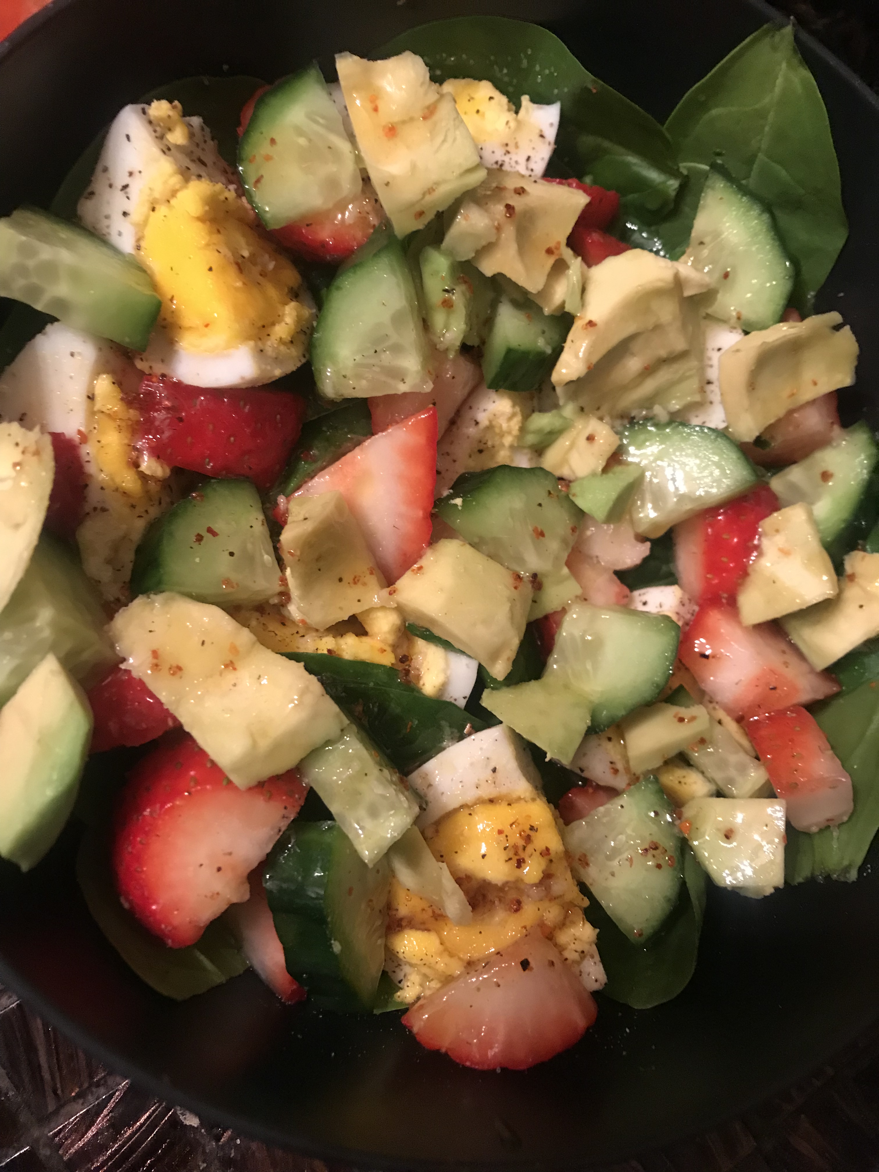 Spinach, eggs, cucumber, strawberry and avocado salad with a homemade dressing (recipe below). This salad is a great meal supplement, snack or you can add chicken for a high protein packed meal to pack on that muscle! Being healthy doesn’t have to taste bad or take long. It just takes a little knowledge, drive and determination.