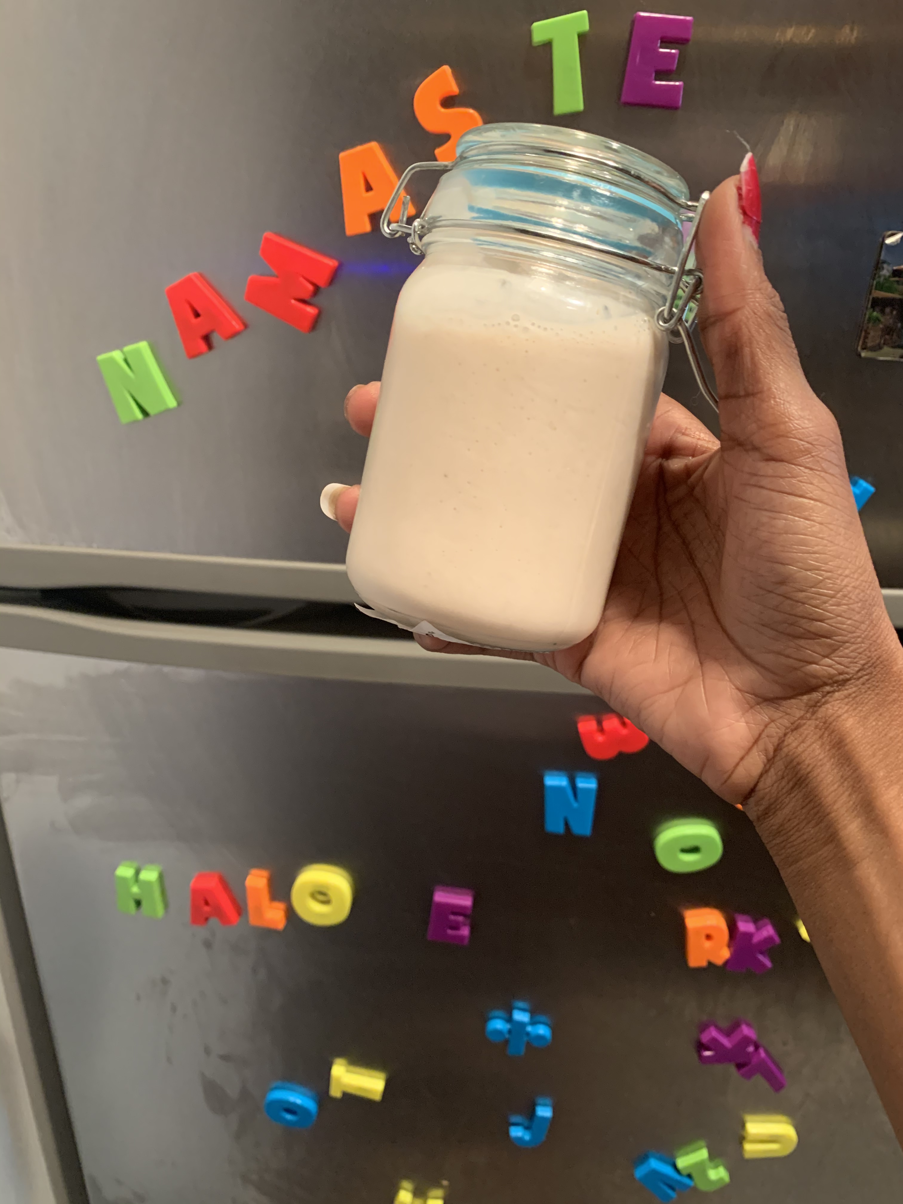 Good morning!!! Today’s smoothie: 1 banana, 1 strawberry yogurt, 1 table spoon flax seeds & 2 squirts on Moringa