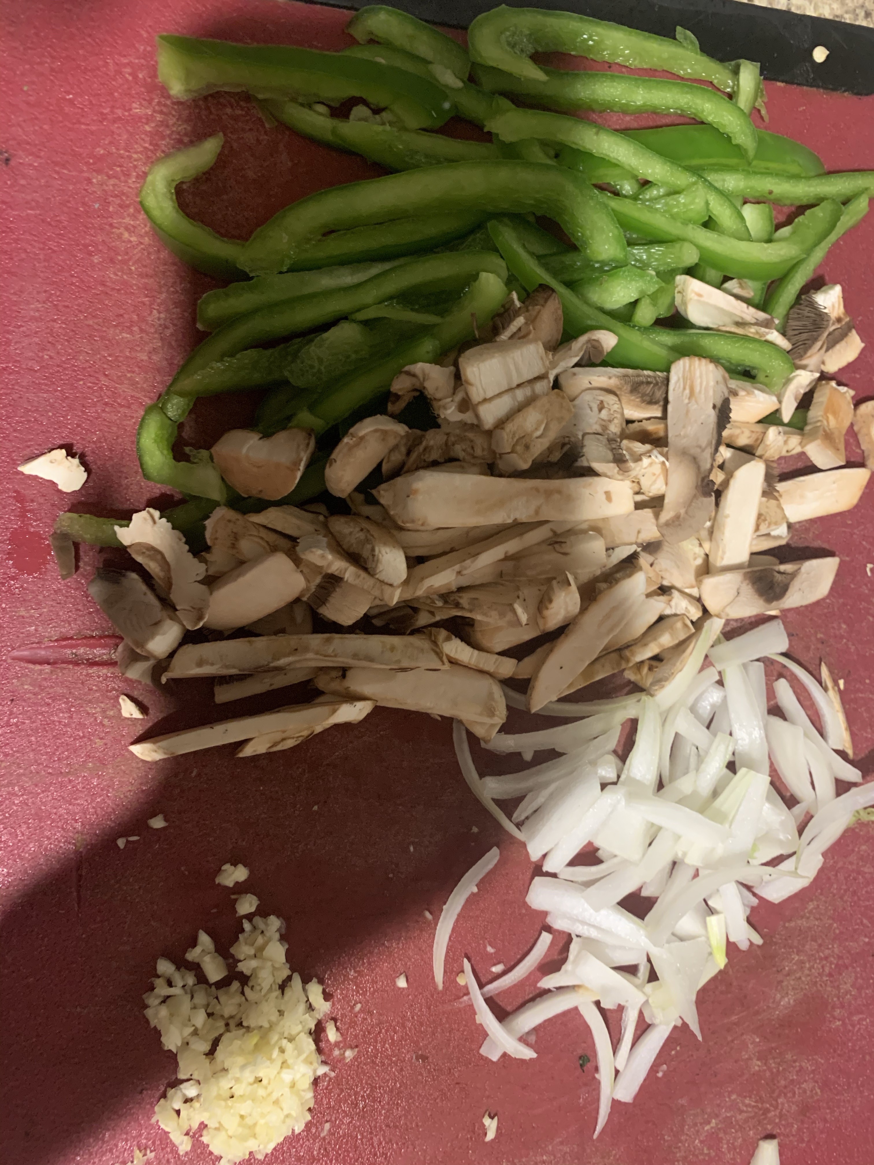 • Cut up your veggies (garlic, onion, mushrooms and bell pepper)