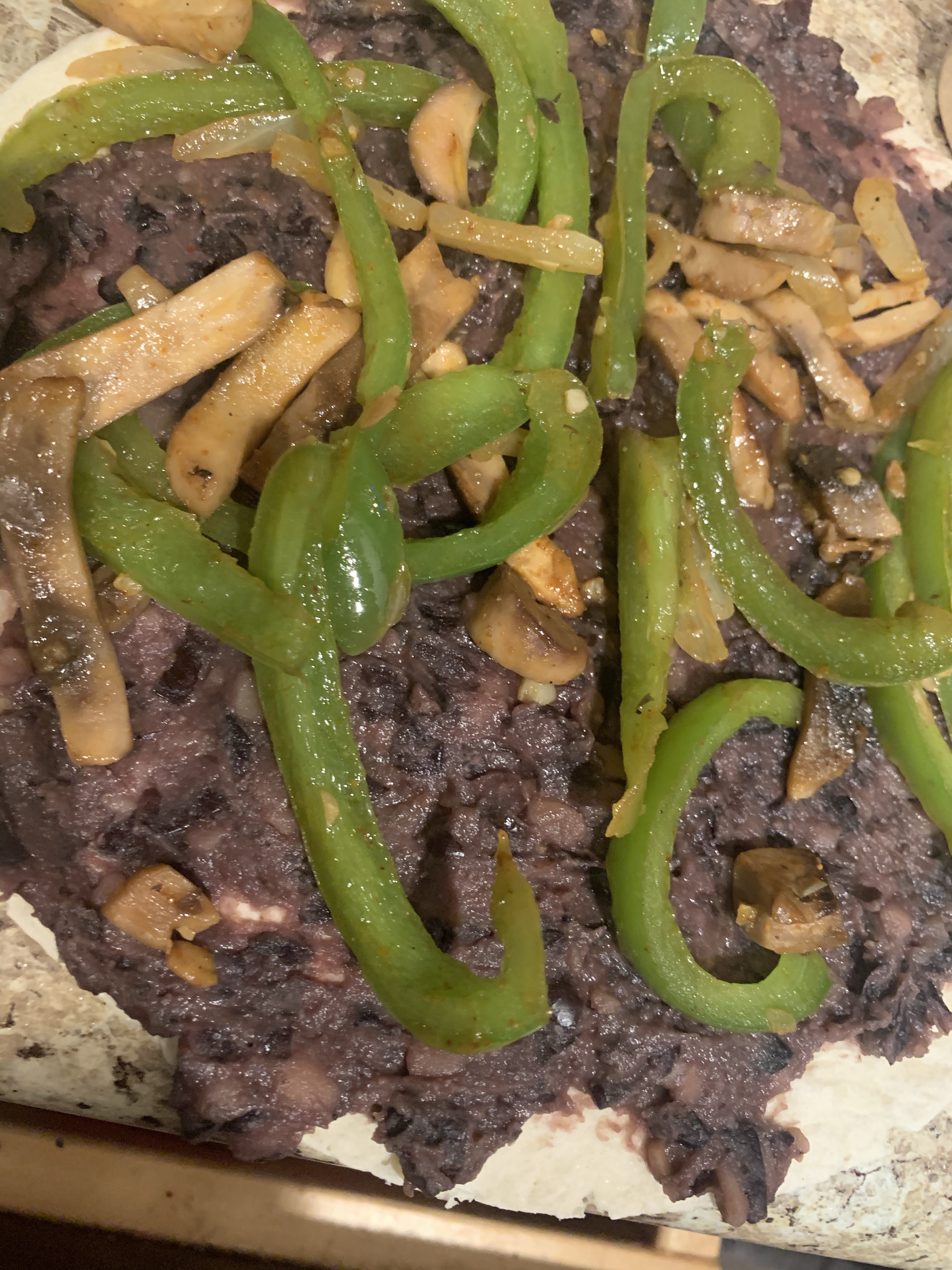 • Lightly oil a pan, heat to medium. Smooth black bean paste on tortilla, add veggies and cheese of choice (I used queso)