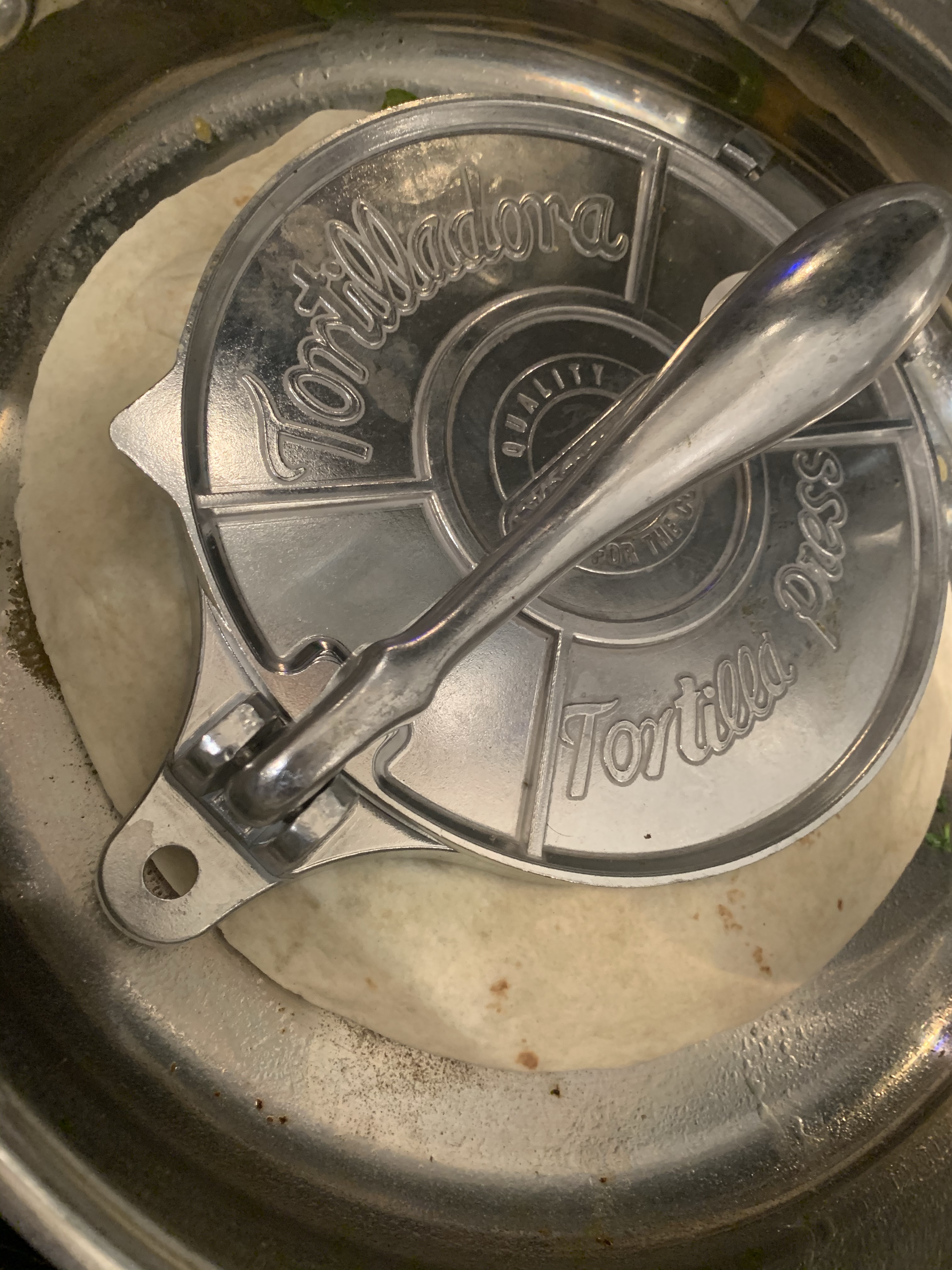 • Add black bean paste to other tortilla and place on top! I use my tortilla maker as a press to get a get crispy side.
