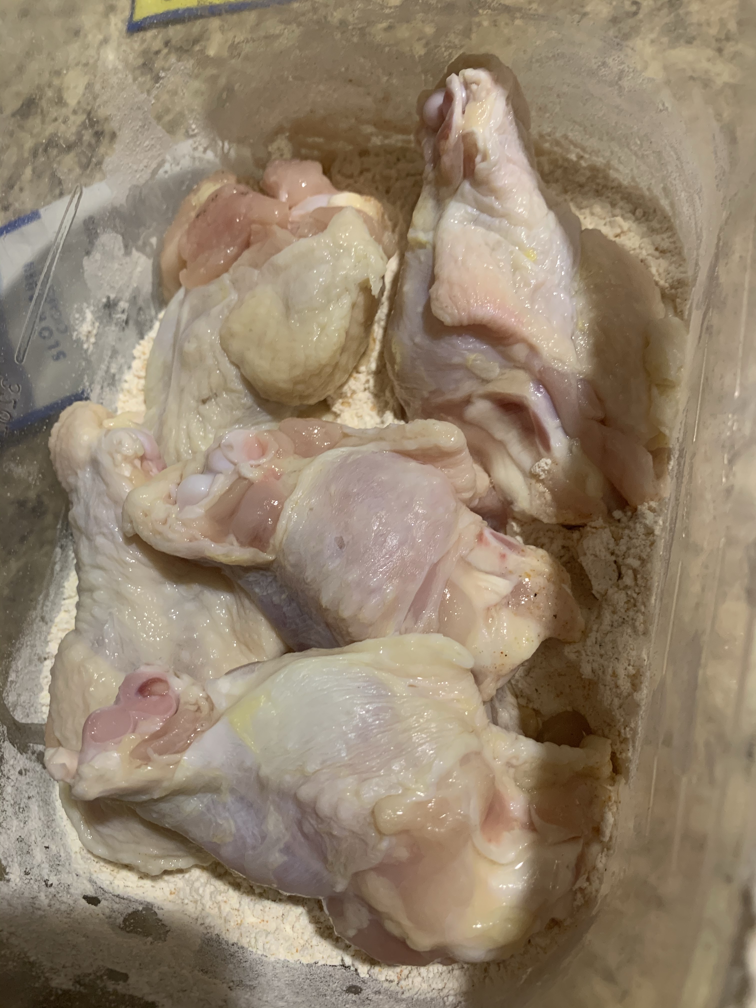 I pulled out my chicken, flour, seasonings and cooking oil and got to work. I know what your thinking what a mess. But I have a few tricks.