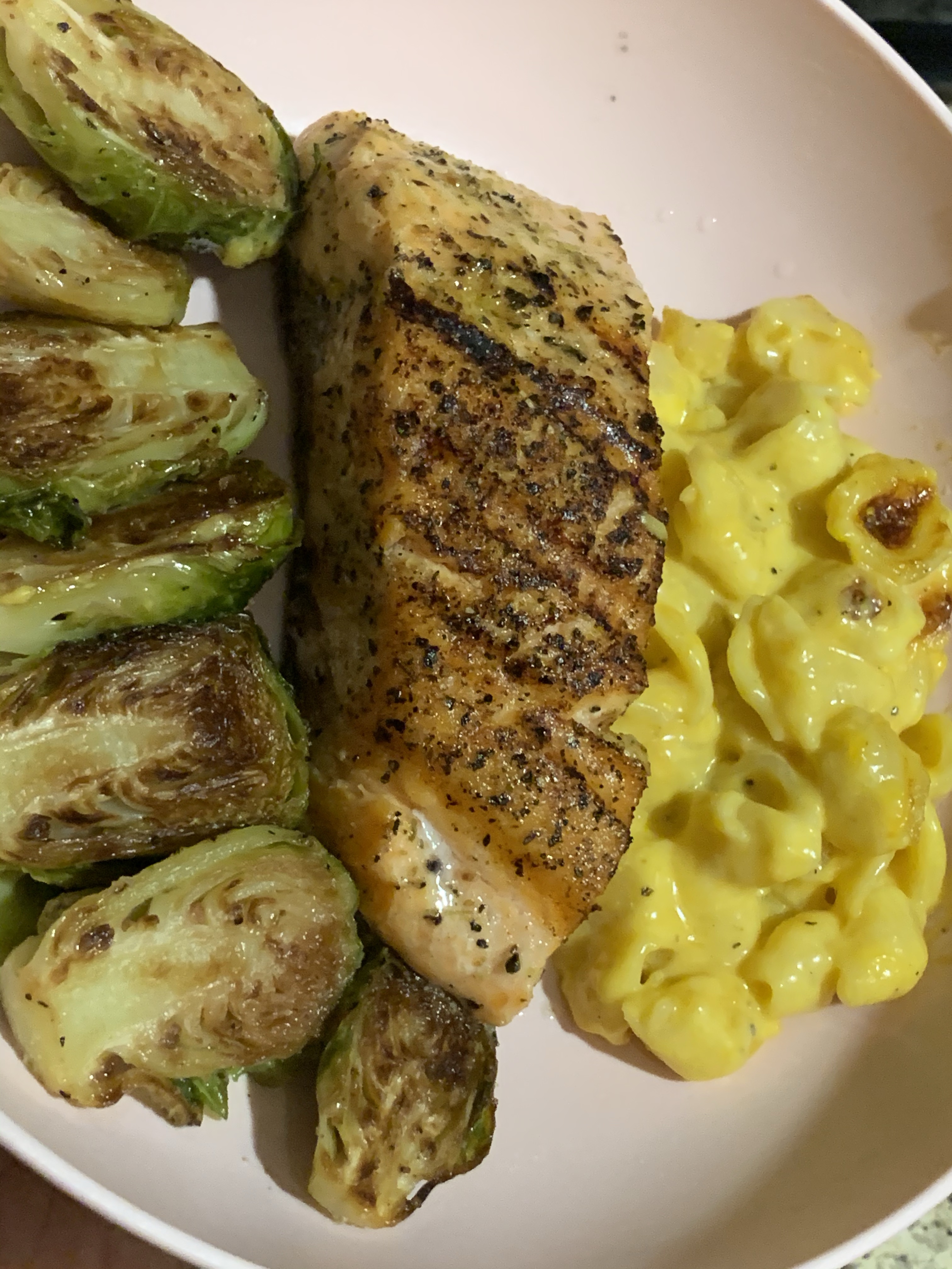 My grill is small great for my little family of two. Add your seasoning, close the lid and walk away. 7 min about, depends on thickness.