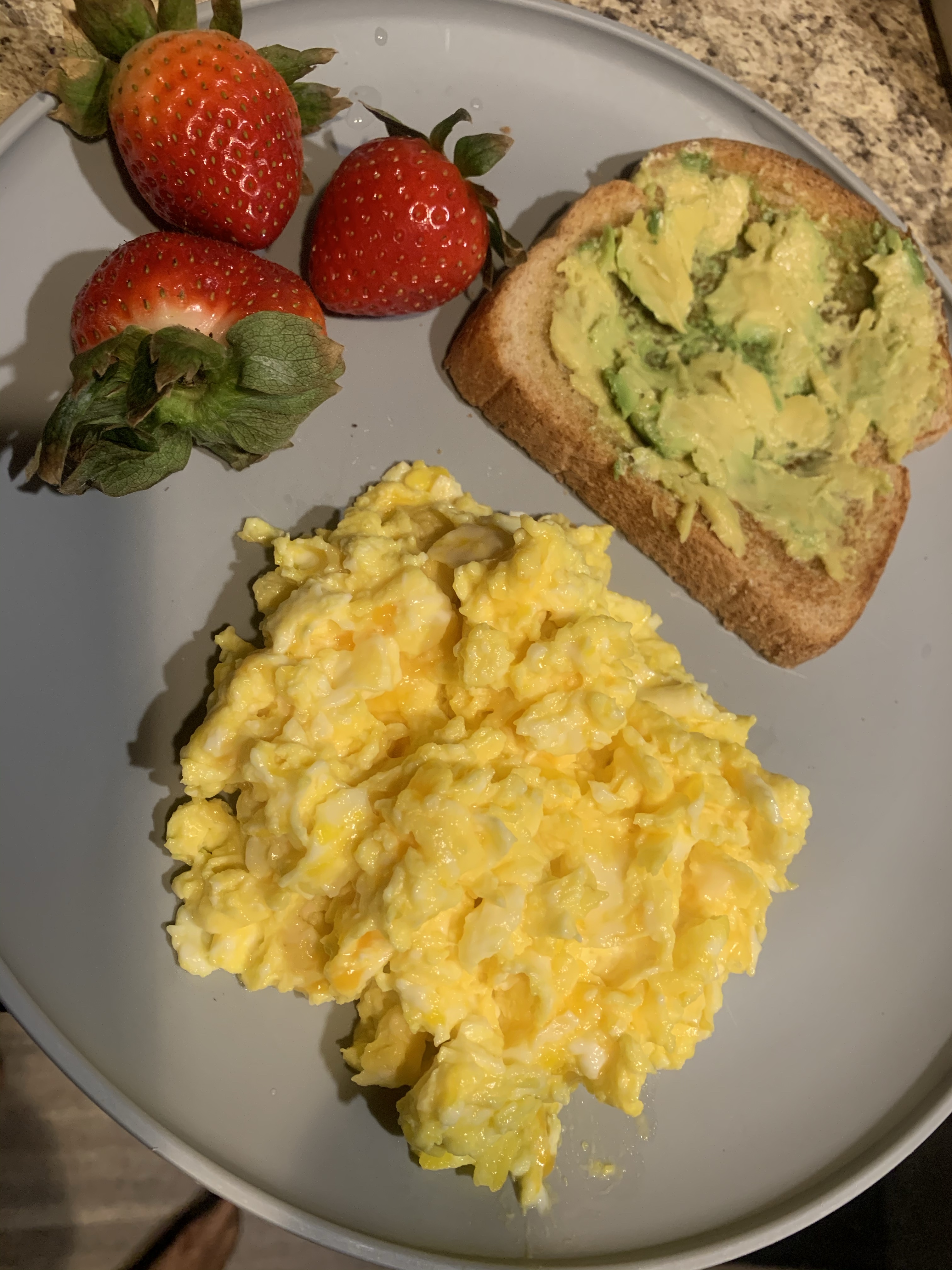 Avocado toast, scrambled eggs and strawberries