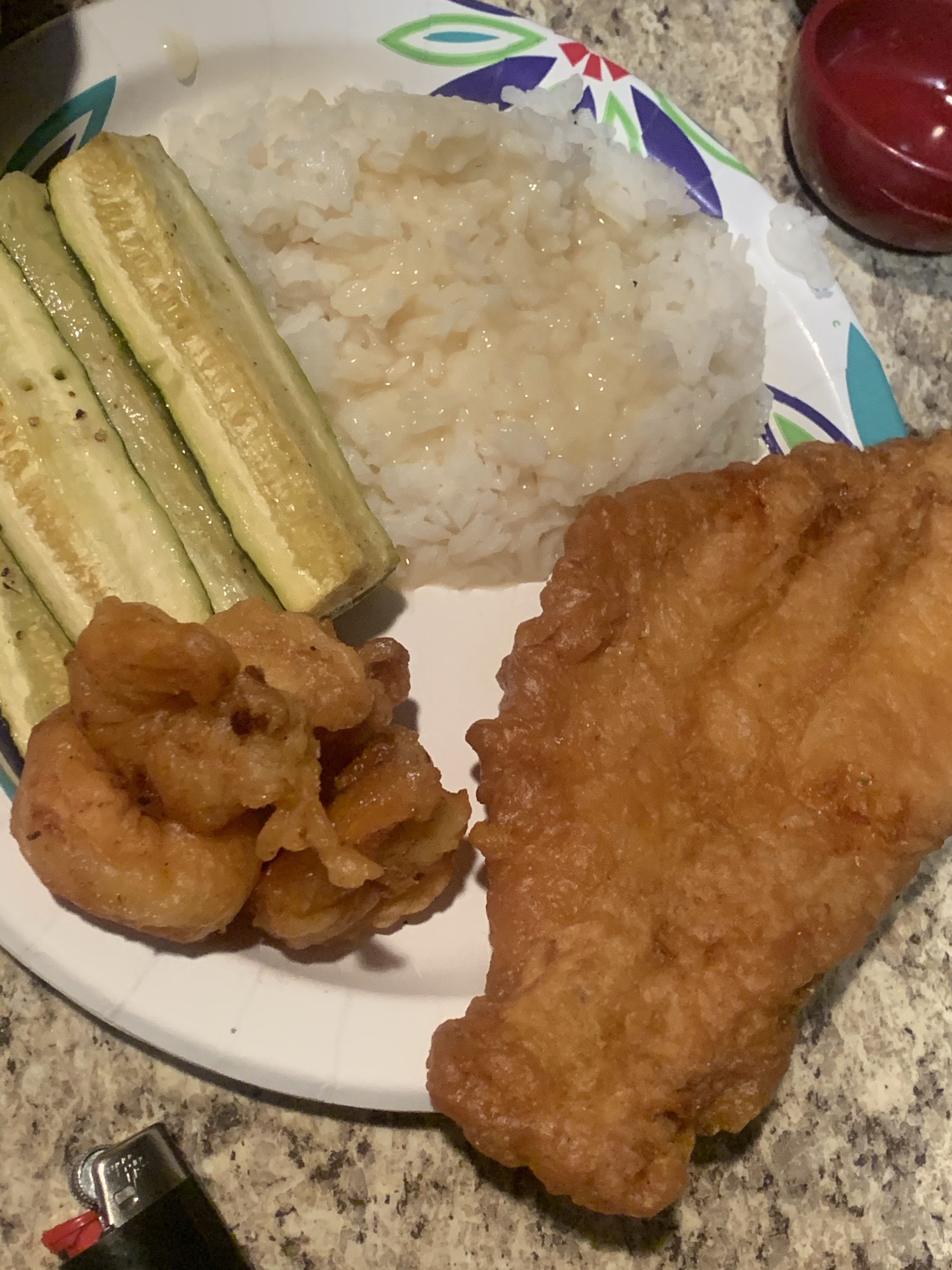 Fried catfish, shrimp, garlic rice and gravy and roasted zucchini stalks