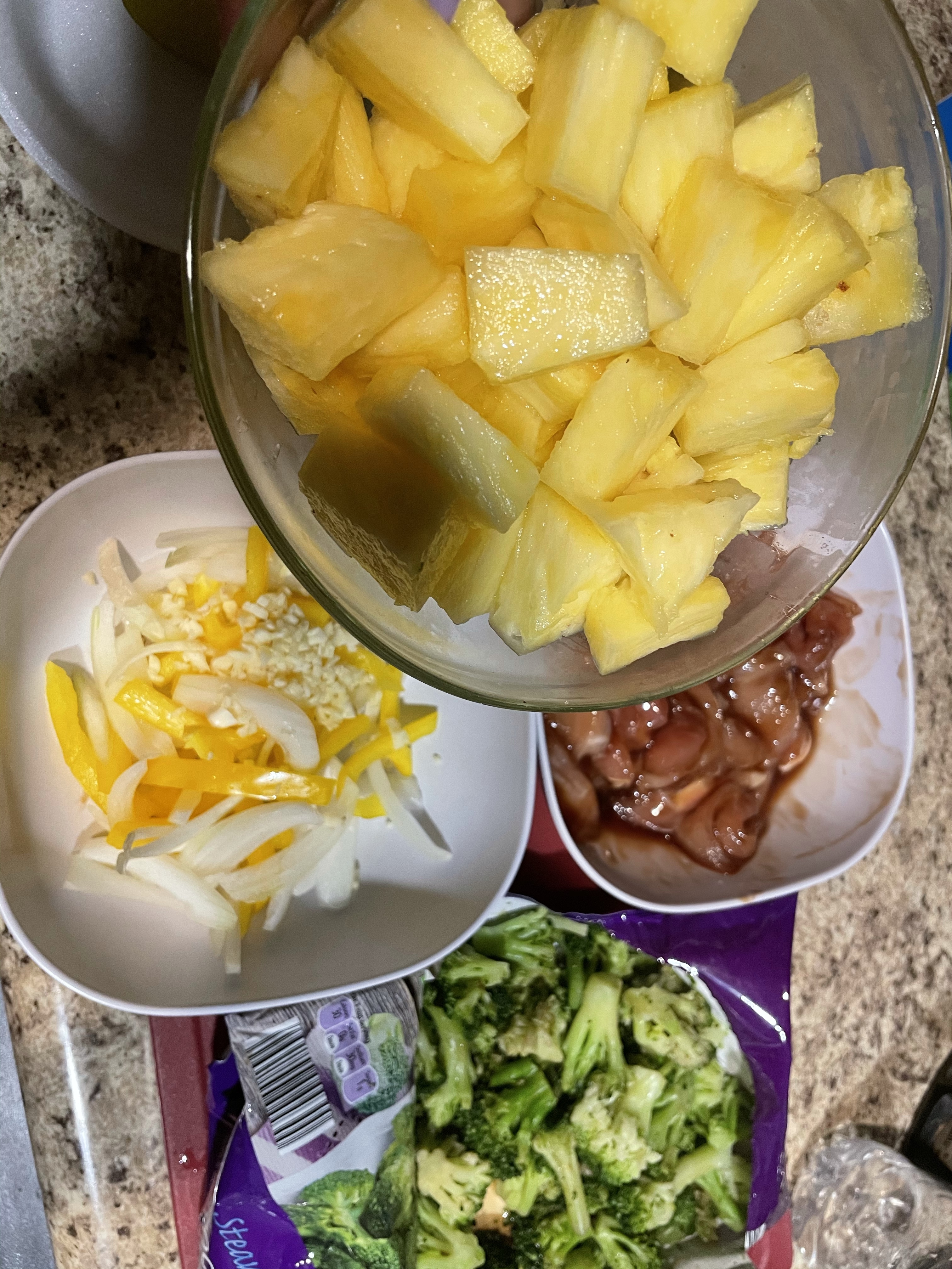 Cut up your veggies, pineapple, and cut chicken into strips (I marinate mine in oyster sauce). I used broccoli so I pre-steamed and seasoned that as well