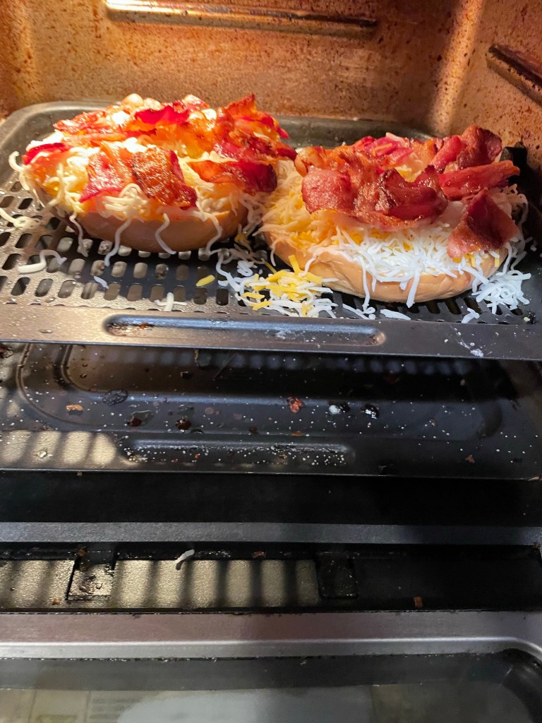 Quick, fast and cheap; though most times this isnt ideal, but when your a working mom of two; it is. Sometimes its hard to sit down and have a meal so quick and tasty things I can make in the air fyer go along way. Someone sent me a bagel covered in cheese and pepperoni; it gave me an idea to do cheese and bacon. Why not
