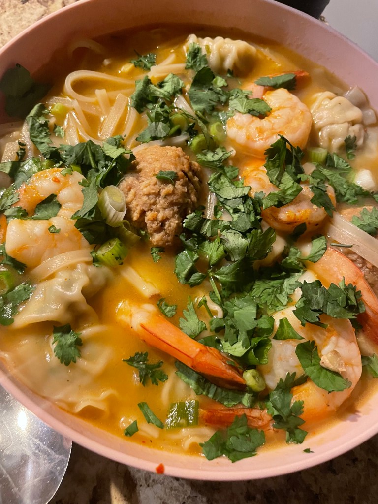 My take on a spicy shrimp ramen. Get yours with or without dumplings.